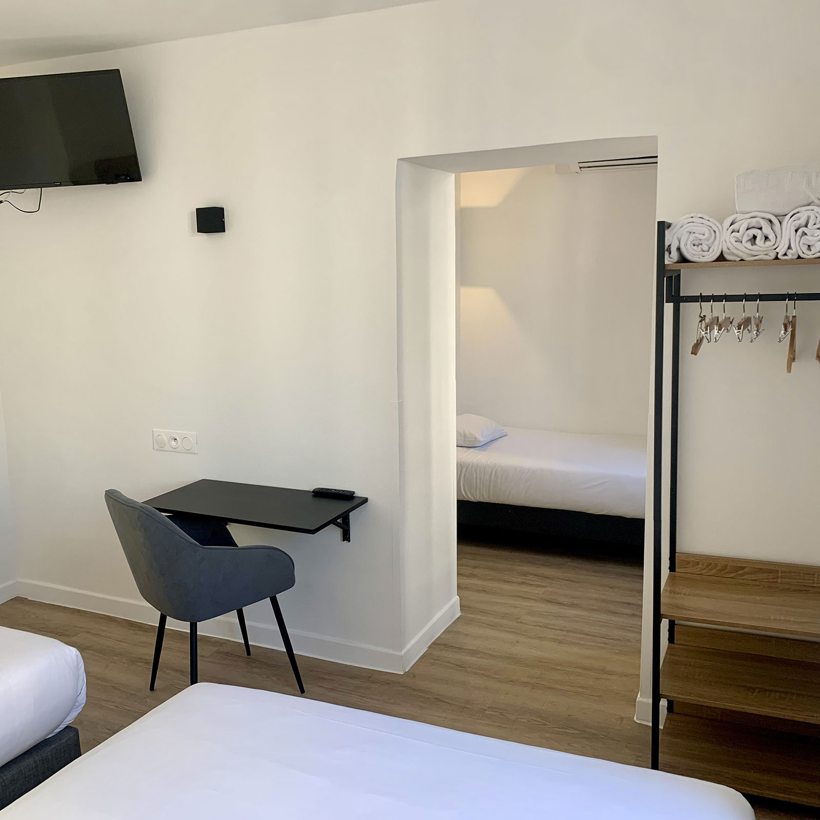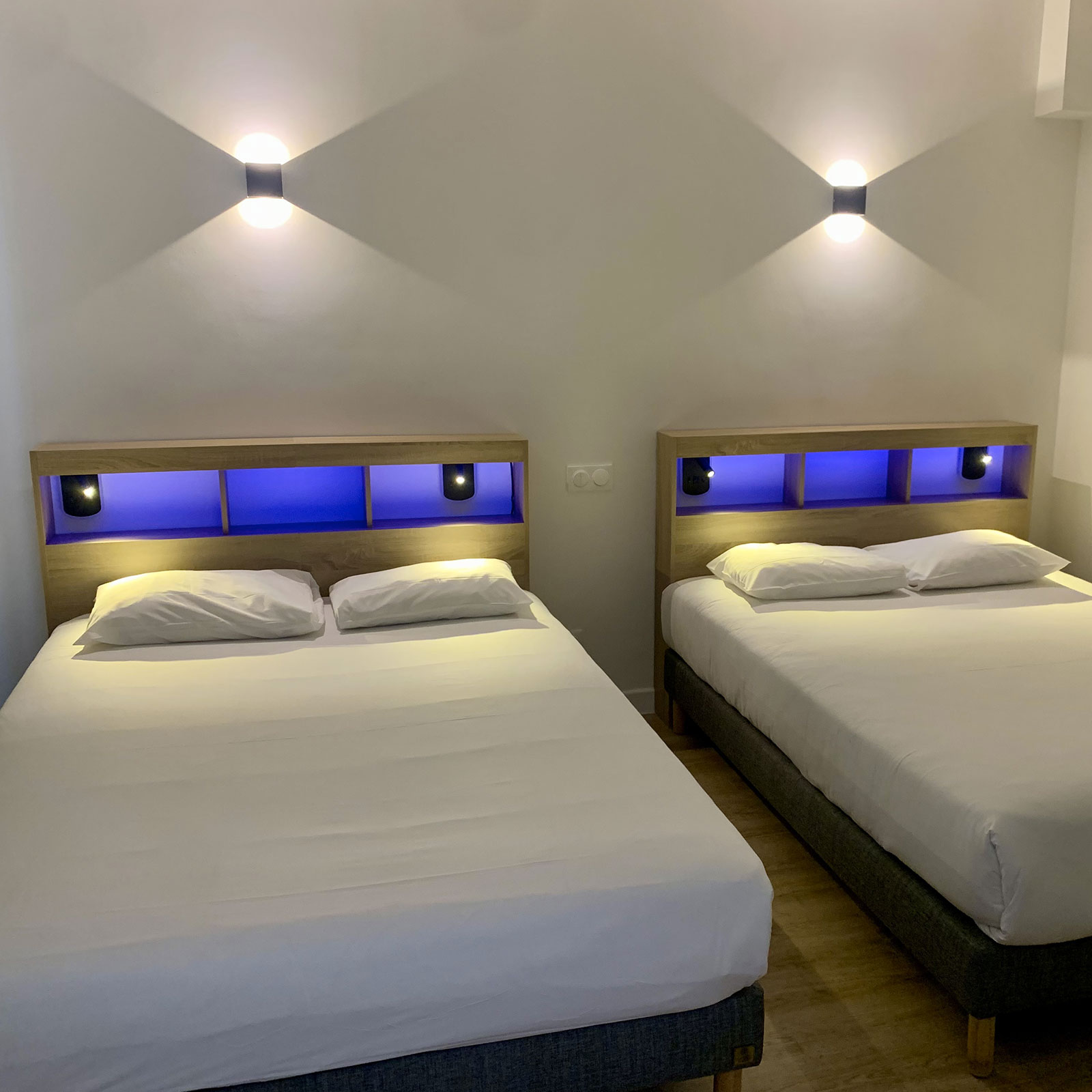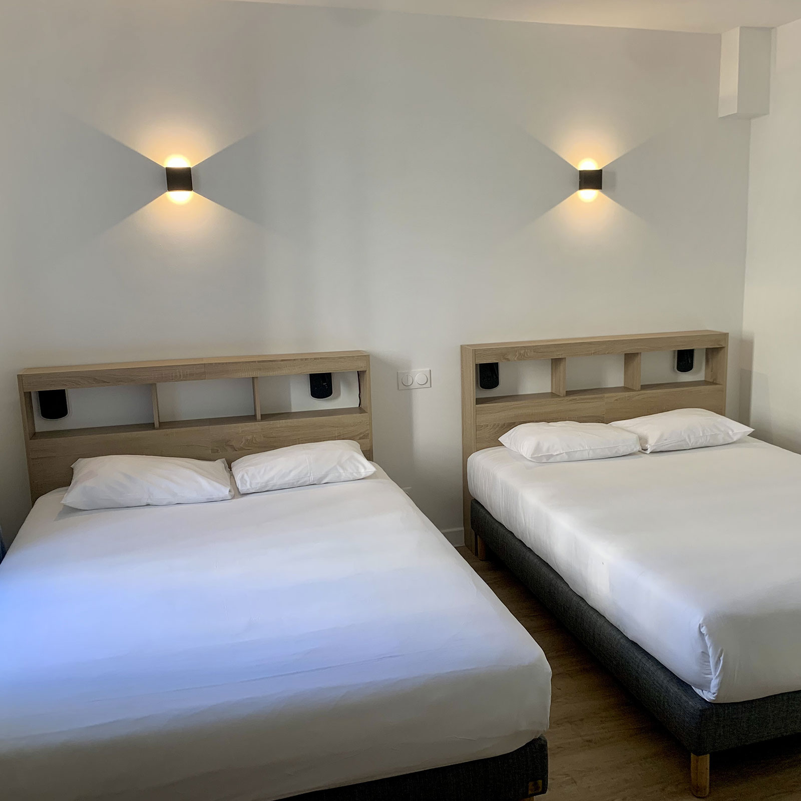 Cette chambre familiale de 20 m2 peut accueillir 4 adultes (2 lits doubles). Elle dispose d'une salle de bains privative avec sèche-cheveux et d'une télévision à écran LCD. Équipements: Bureau, Chauffage, Douche, Sèche-cheveux, Toilettes, Salle de bains, Téléphone, Télévision à écran plat, Service de réveil.